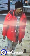 The suspect was a male wearing a black hat, a red hooded jacket, black jeans, and white-and-black shoes.