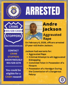 Following the investigation, on February 6, 2026, Memphis Police officers located and arrested 27-year-old Andre Jackson in the 6300 block of Oregon Drive.