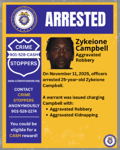 A warrant was issued for Zykeione Campbell, 25, charging him with Aggravated Robbery and Aggravated Kidnapping. He is currently in custody in Mississippi.