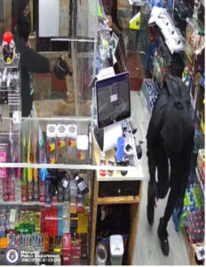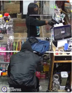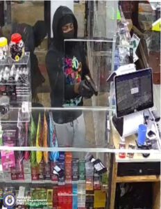 On Thursday, October 9, 2025, at 10:22 p.m., officers responded to a business robbery at the Airways Smoke Shop located at 4907 Airways Boulevard. Officers were advised that two males entered the business armed with a handgun. The first male climbed through a service window to access the area behind the counter where the clerk was located. The second male pointed a handgun at the clerk. The first male began taking tobacco products and THC products from the display shelves and placed them into the black backpack. The suspects fled the scene on foot.