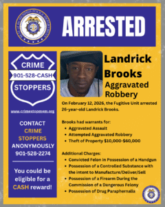 On February 12, 2026, members of the MPD Fugitive Unit served an active felony warrant in the 3700 block of Parkline Drive. They located 26-year-old Landrick Brooks, who was wanted for Aggravated Assault, Attempted Aggravated Robbery, and Theft of Property valued between $10,000 and $60,000. Brooks was taken into custody without incident.