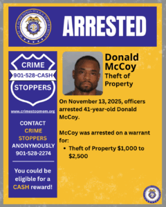 - Donald McCoy, 41 – Arrested on a warrant for Theft of Property ($1,000–$2,500)