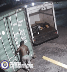 On Tuesday, August 12, 2025, at 2:19 am, officers responded to a Theft from a Semi-Trailer complaint at 2315 Elvis Presley Boulevard. Officers were advised that the suspect was captured on camera breaking into a container that was on the property. The complainant advised that the suspect took various tools from the container with a combined value of $2,800. The suspect was occupying a white box truck at the time of the theft.